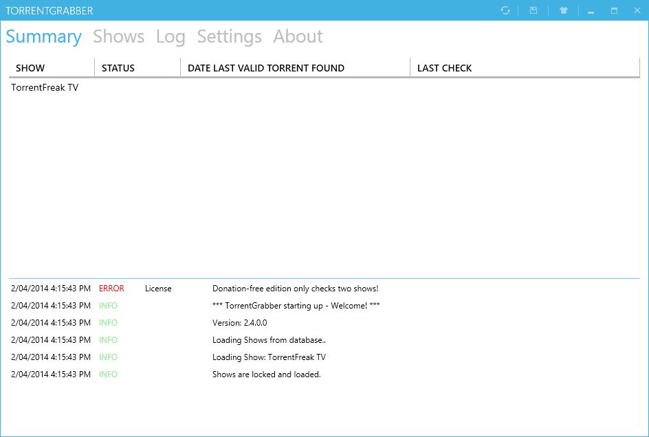 TorrentGrabber will automatically manage 2 shows straight out of the box. If you want more you can donate to my t-shirt fund and you’ll receive a donation key to unlock the ability to have as many shows as you want!